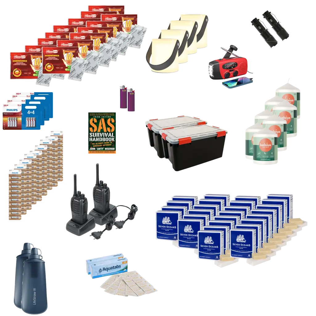 The advantage of an emergency kit over buying individual items is on average 50 euros*! You also get rid of the hassle of sorting out what you need. All you have to do is add items that you probably already have at home. Things that are important for your situation. Think of things like medicines, copies of identity documents, cash and e.g. some toiletries like toilet paper, sanitary towels, toothpaste, toothbrushes, etc.